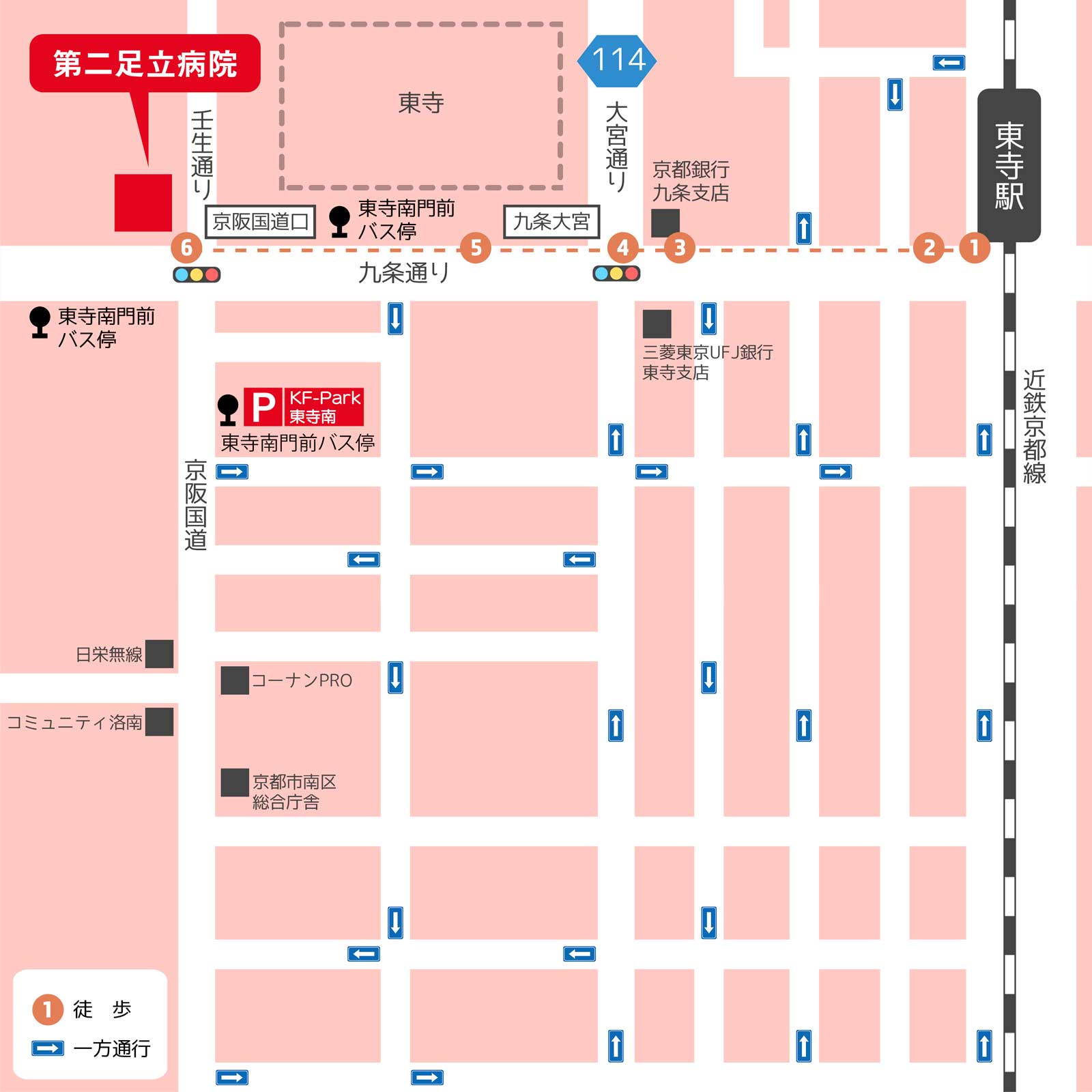 アクセス 周辺地図 Google Mapはこちら 経路情報 近鉄「東寺」駅より徒歩でご来院の方 ①近鉄「東寺」駅の改札を出て、すぐ「右手方向(西向き)」に曲がります。 ②そのまま道路(九条通り)沿いに「まっすぐ(西向き)」進みます。 ③しばらく進むと右手に「京都銀行」が見えてきます。 ④右手に「東寺」が見える横断歩道を渡ってください。 ⑤「東寺」の前を通過します。 ⑥しばらく進むと右手に第二足立病院の建物が見えてきます。お疲れ様でした。 駐車場について お車でお越しの際、駐車場は病院横の駐車場及びKF-park東寺南をご利用ください。KF-park東寺南につきましては、必ず駐車をされた時に駐車証明書を発行の上ご来院ください。駐車証明書のご提示が無い場合は駐車券をお渡し出来かねます。教室・面会時及び21日/毎月の駐車券の配布はしておりません。詳細につきましては以下リンクよりご確認ください。契約駐車場のご案内